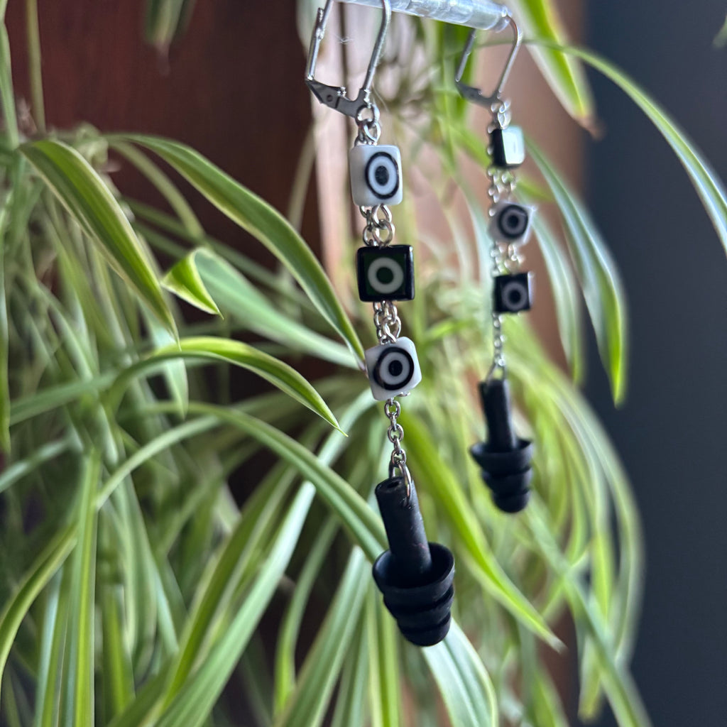 A trio of modern evil eye beads dangle with ease, adding movement and intrigue to these earplug earrings. Pop these on so you can protect your ears at loud events or soften the hum in noisy places.