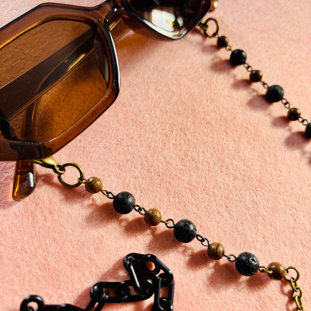 Tired of losing your glasses? We've got you covered with our 'Amber Alps' chain. Perfect for any occasion, this unique piece has been handcrafted with an organic striped amber wood, textured black lava, and antique chain. So don't let your glasses slip down the 'Amber Alps' -- attach them to this earthy, fashion-forward chain!